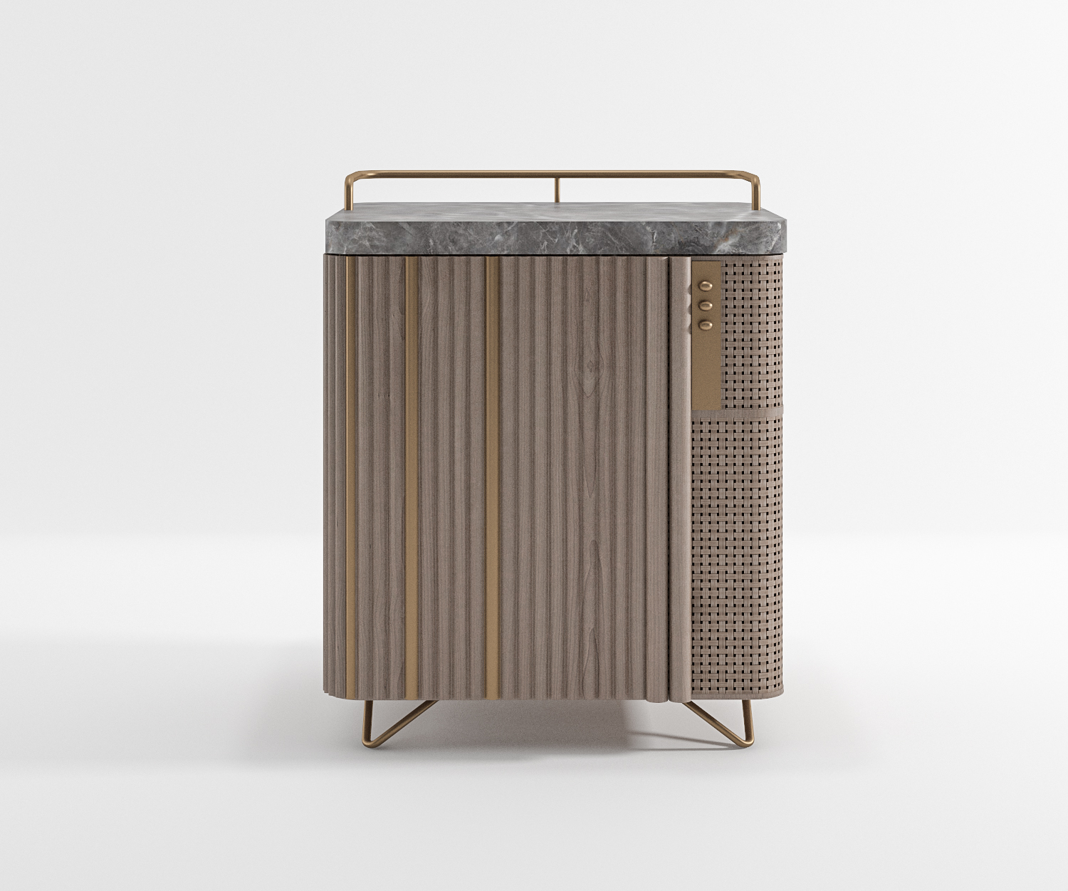 Material Marle countertop, Brushed brass rack, Rattan cabinet finish, Solid wood handle stain finish, Flutter design in solid wood finish, S.S tube base.