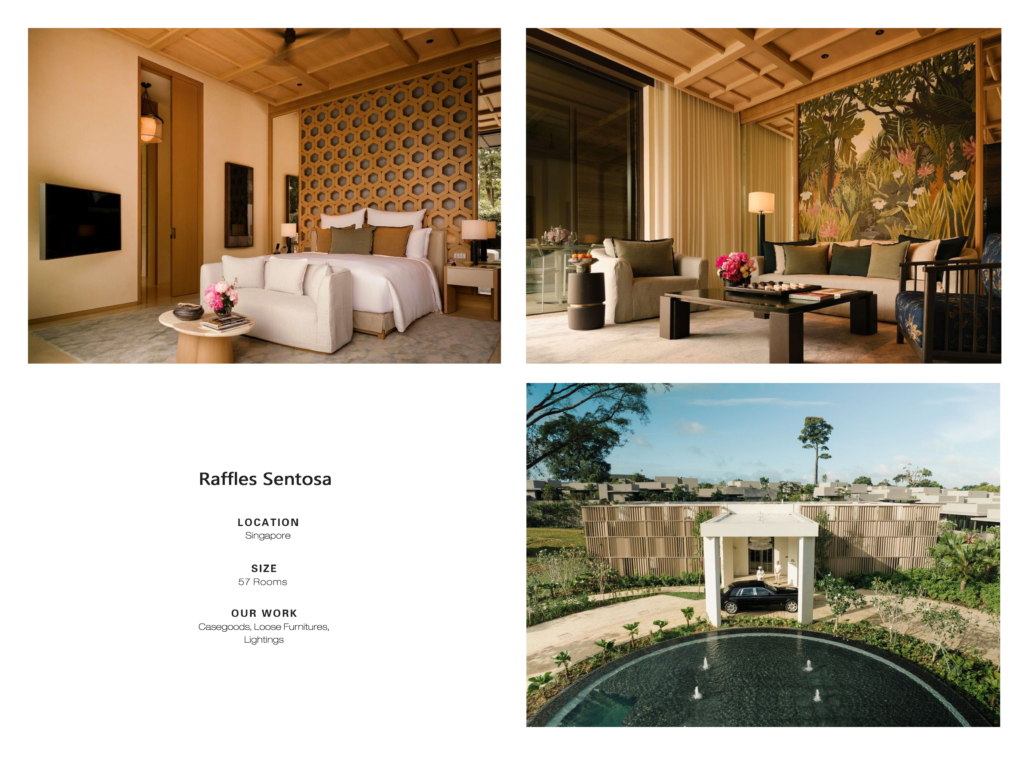 For the Raffles Sentosa project, our bespoke solutions define ultra-luxury resort living through meticulously crafted casegoods, loose furniture, and lighting.
